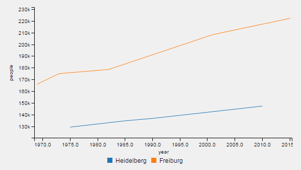 Hence, 2D data is having the following assignment: year → people. In the vector peopleHD, four values are defined, in the vector peopleFreiburg, five values are defined. The defined years are different for Heidelberg (1975-2010) than for Freiburg (1969-2015).