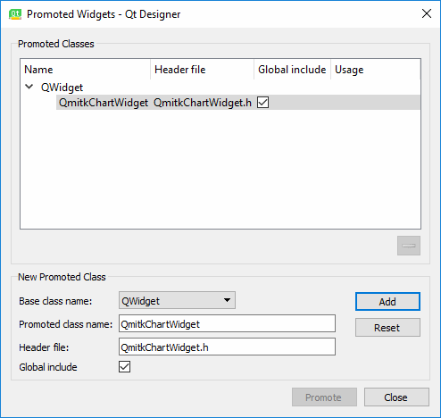 MODULE_DEPENDS MitkChart.Open the ui file of the plugin. Then add a widget (we always use the name chartWidget in the following) at the desired position. Change the class of the widget to a user-defined widget (right click → user defined classes, see https://doc.qt.io/qt-6/designer-using-custom-widgets.html). Set "QWidget" as base class. Set "QmitkChartWidget" as class name and "QmitkChartWidget.h" as include file.